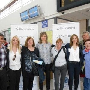 Στο αεροδρόμιο τους υποδέχθηκαν ο Δήμαρχος Ρόδου κύριος Φώτης Χατζηδιάκος, η Αερολιμενάρχης κυρία Ξανθή Κριτσινέλια, η Αντιδήμαρχος Τουρισμού, Διεθνών Σχέσεων και Απόδημων Ροδίων κυρία Μαρίζα Χατζηλαζάρου, ο Πρόεδρος του Δ.Ο.Π.Α.Ρ. κύριος Σέργιος Αϊβάζης, ο Γενικός Διευθυντής του Οργανισμού Προώθησης Ροδιακού Τουρισμού κύριος Μπάμπης Παλογιαννίδης, η Διευθύντρια της Διεύθυνσης Τουρισμού του Δήμου Ρόδου κυρία Βεατρίκη Σέρβου, τα στελέχη της Διεύθυνσης Τουρισμού κυρία Αναστασία Σαββιού, Σέβα Τσίμπλη και Βλάσης Φακιόλης, η προϊσταμένη του Τμήματος Δημοσίων Σχέσεων και Γραφείου Τύπου του Δήμου Ρόδου κυρία Μαρία Καραμπίνη και από πλευράς Εμπορικού και Βιομηχανικού Επιμελητηρίου Δωδεκανήσου ο αντιπρόεδρος της Δ.Ε.Τ.Α.Π. και μέλος του Τουριστικού Τμήματος του Επιμελητηρίου Δωδεκανήσου κύριος Σάββας Παγωνάκης.