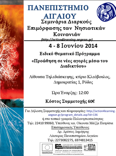 Το Πανεπιστήμιο Αιγαίου διοργανώνει εκπαιδευτικό σεμινάριο με θέμα «Προώθηση σε νέες αγορές μέσω του Διαδικτύου». Το σεμινάριο