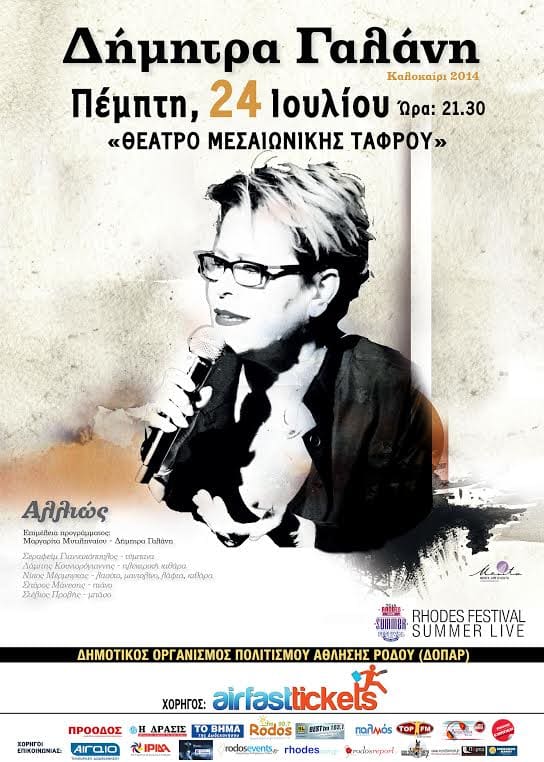 Δήμητρα Γαλάνη Καλοκαίρι 2014 Live στο Θέατρο Μεσαιωνικής Τάφρου «Αλλιώς» Πέμπτη 24 Ιουλίου Φέτος το καλοκαίρι θα