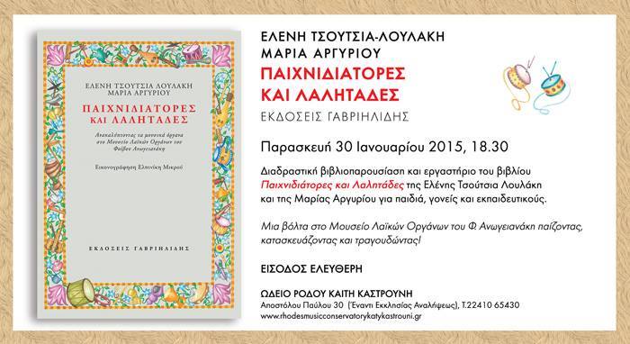 Το ωδείο “Καίτη Καστρουνή” και το βιβλιοχαρτοπωλείο “Σχολική Φωλιά” σας προσκαλούν στην διαδραστική παρουσίαση του βιβλίου “ΠΑΙΧΝΙΔΙΑΤΟΡΕΣ