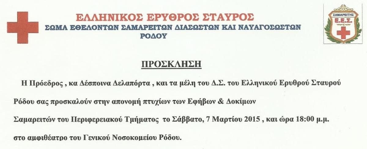 Η πρόεδρος κ. Δέσποιανα Δελαπόρτα και τα μέλη του ΔΣ του Ερυθρού Σταυρού Ρόδου σας προσκαλούν στην