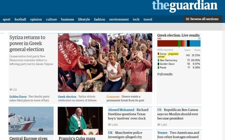 «Ο ΣΥΡΙΖΑ επιστρέφει στην εξουσία» είναι ο τίτλος του πρώτου θέματος του Guardian για το εκλογικό αποτέλεσμα