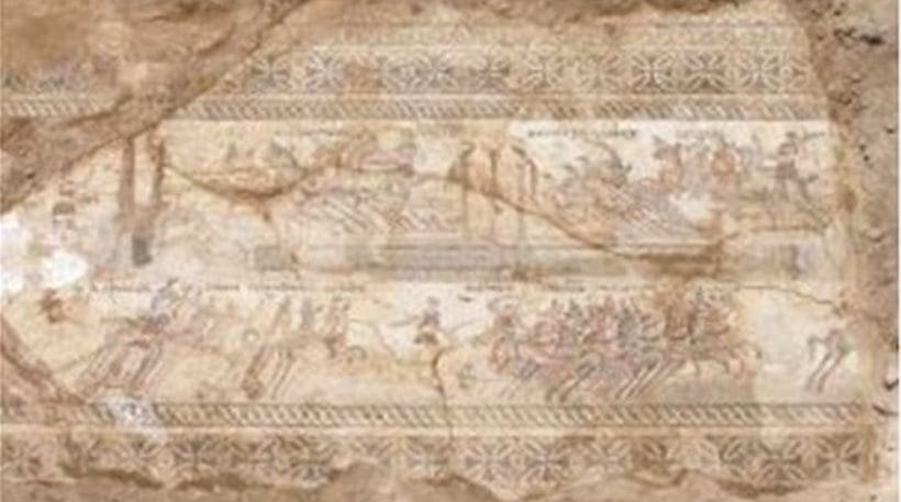 Το αποκαλυφθέν τμήμα του ψηφιδωτού απεικονίζει παράσταση αρματοδρομιών σε εξέλιξη εντός ιπποδρόμου και πλούσιο γεωμετρικό διάκοσμο Τμήμα