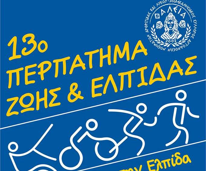 Ο Δωδεκανησιακός Σύλλογος Αυτοάνοσων Νοσημάτων Αρθρίτιδας και Λύκου «ΘΑΛΕΙΑ», διοργανώνει το 13ο Περπάτημα Ζωής και Ελπίδας, την