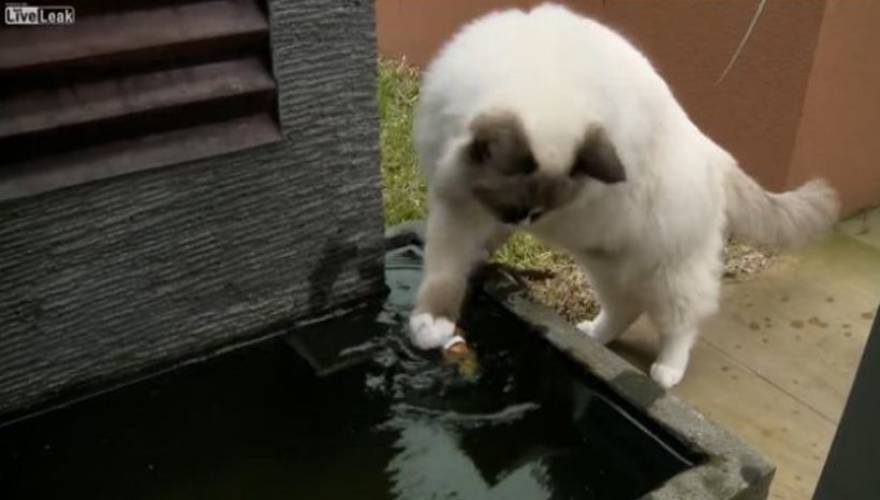 Στις εικόνες βλέπουμε μία γάτα να παρακολουθεί ένα ψάρι που κινδυνεύει να πεθάνει, καθώς έχει βρεθεί σε