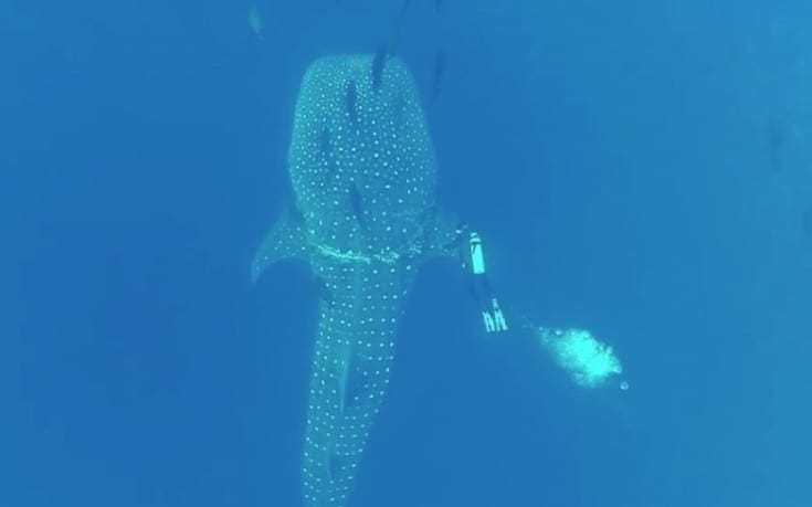 Υπέφερε ο εικονιζόμενος φαλαινοκαρχαρίας από γιγάντια πετονιά, ένα σχοινί που είχε μπλεχτεί γύρω από το σώμα του και