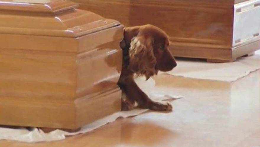 Ένα μικρό σκυλάκι κόκερ σπάνιελ στέκεται ακούραστος φρουρός δίπλα σε ένα από τα τριάντα τέσσερα φέρετρα στο