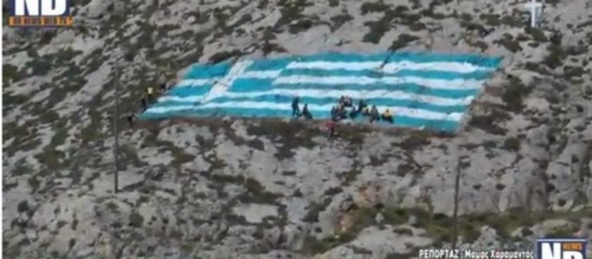 Μια γιγαντιαία Ελληνική σημαία 375 τμ (15Χ25) ,ζωγράφισαν την Μεγάλη Δευτέρα κάτοικοι της Καλύμνου στα βόρεια υψώματα