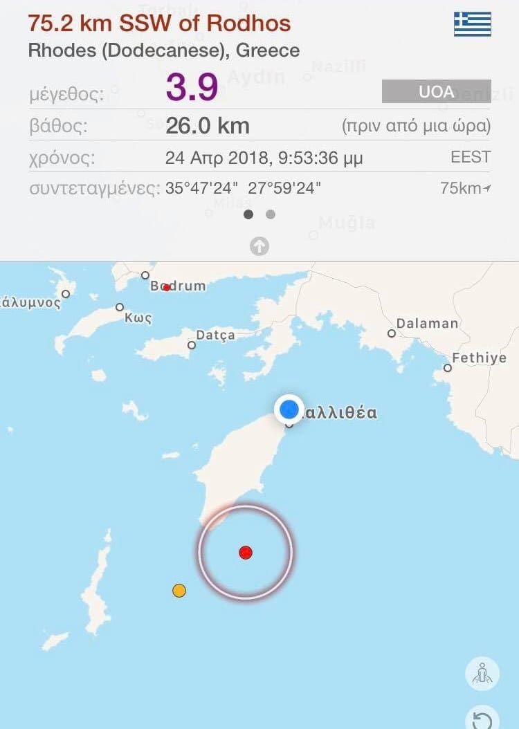 Σεισμική δόνηση 3,9 βαθμών της κλίμακας Ρίχτερ , σημειώθηκε πριν απο μια ώρα περίπου 75 χιλιόμετρα Νοτιοανατολικά