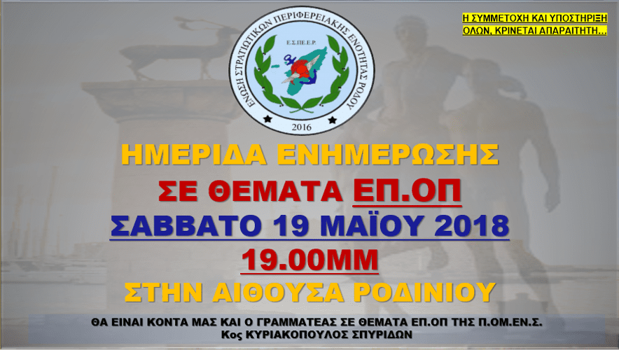 Το Διοικητικό Συμβούλιο της Ένωσης Στρατιωτικών Περιφερειακής Ενότητας Ρόδου, διοργανώνει ημερίδα ενημέρωσης σε θέματα Επαγγελματιών Οπλιτών το