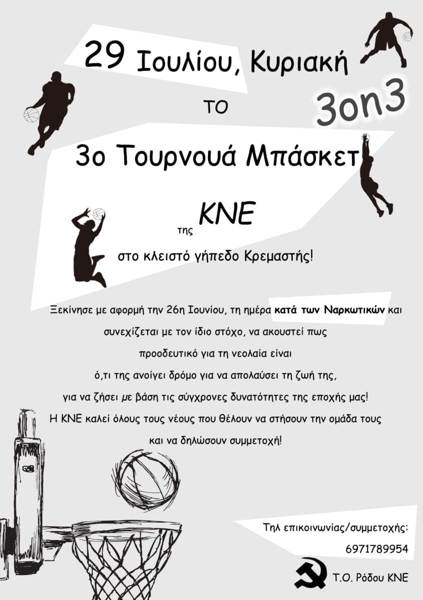 29 Ιουλίου, Κυριακή, για άλλη μια φορά το 3on3 Τουρνουά Μπάσκετ της ΚΝΕ στο κλειστό γήπεδο Κρεμαστής!