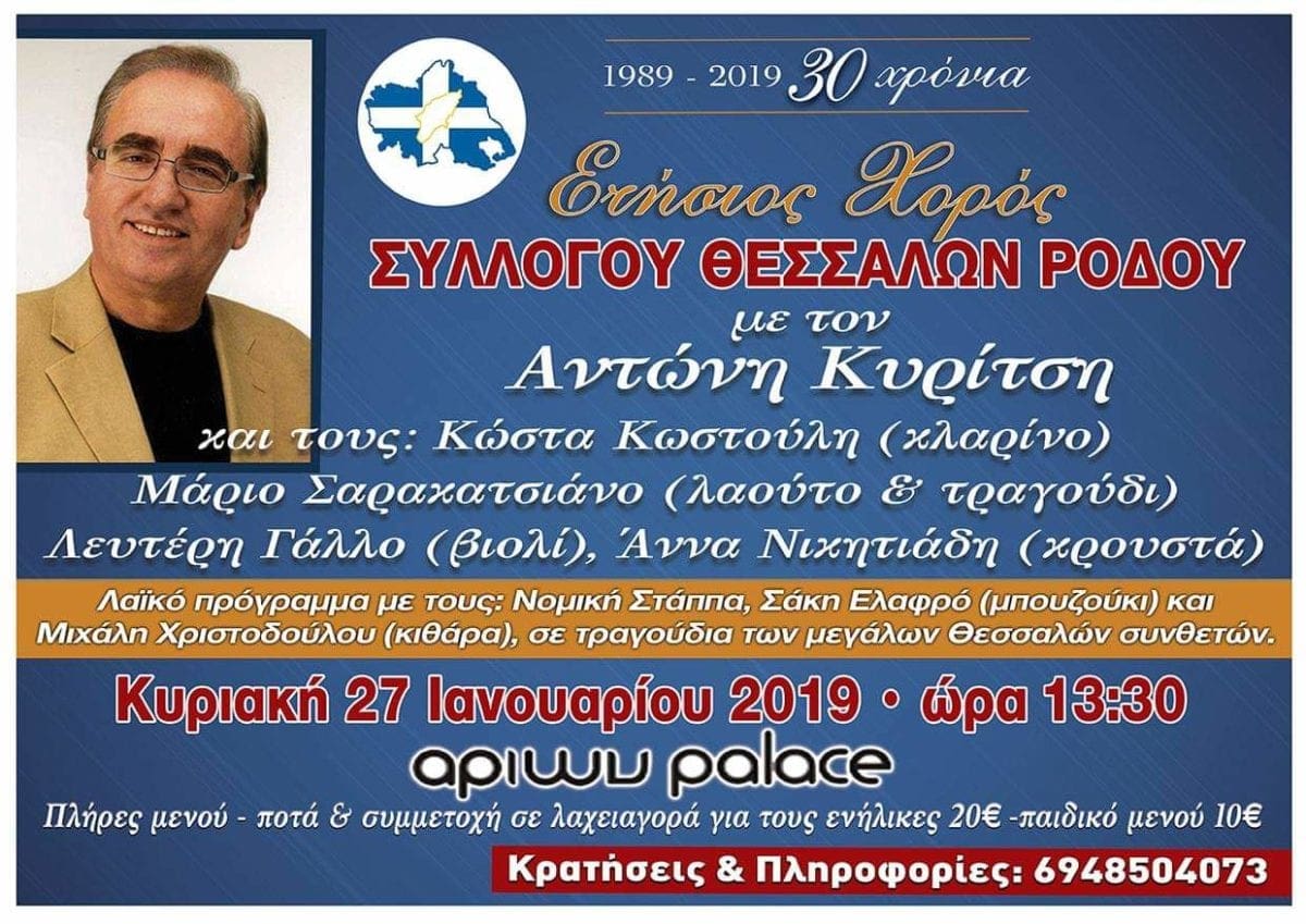 Σας προσκαλούμε στον ετήσιο χορό του Συλλόγου Θεσσαλών Ρόδου, την Κυριακή 27 Ιανουαρίου στο Αρίων palace και