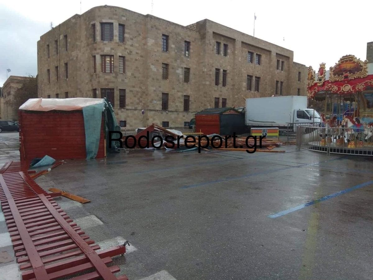 Ο δυνατός αέρας χθες το βράδυ στην πόλη της Ρόδου προκάλεσε κάποιες ζημιές στα σπιτάκια του χριστουγεννιάτικου