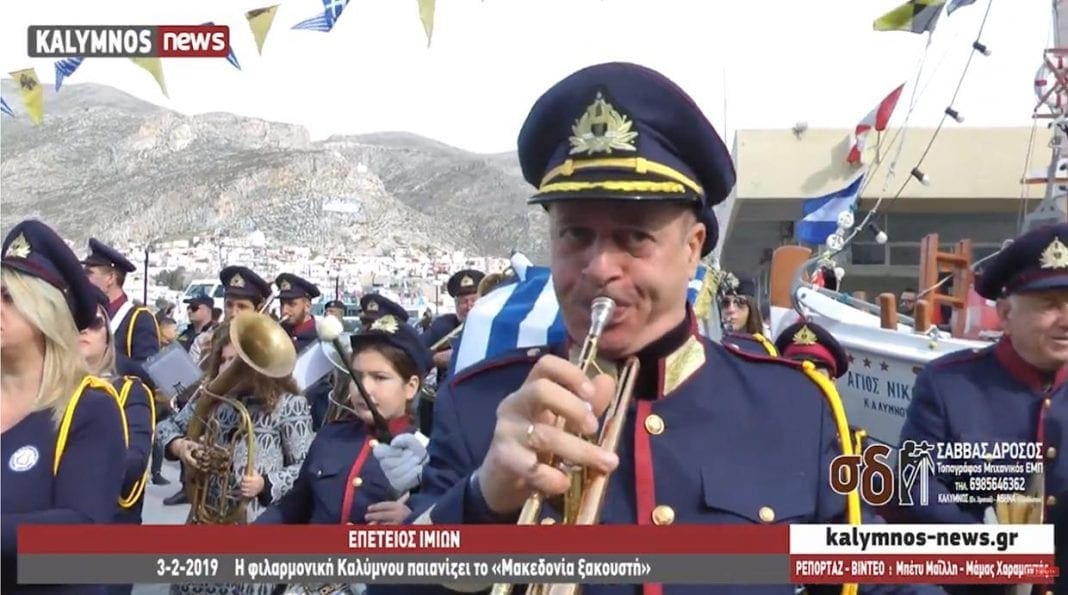 Η δημοτική φιλαρμονική Καλύμνου παιανίζει το εμβατήριο «Μακεδονία ξακουστή» στην εκδήλωση μνήμης για τους 3 Αξιωματικούς ΠΝ που έχασαν