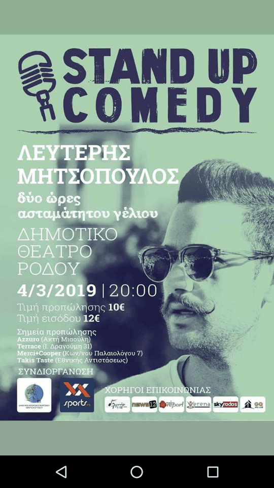 Την Δευτέρα 4/3/2019 θα βρίσκομαι στο Δημοτικό Θέατρο για να παρακολουθήσω την 2η σόλο stand up comedy