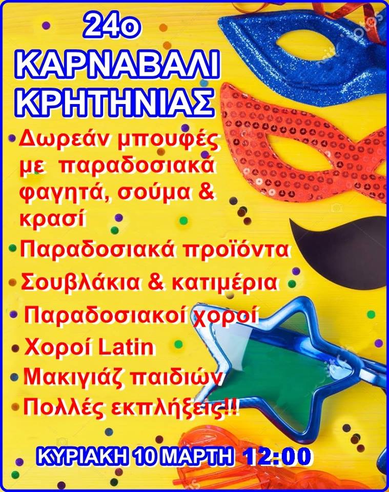 Ο Πολιτιστικός Σύλλογος Κρητηνίας σας προσκαλεί στο καθιερωμένο καρναβάλι Κρητηνίας την Κυριακή 10 Μαρτίου στις 12.00 στην