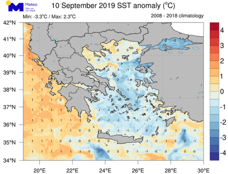 Ελαφρώς ψυχρότερες είναι τις τελευταίες εβδομάδες οι θερμοκρασίες της επιφάνειας της θάλασσας στο Αιγαίο σε σχέση με