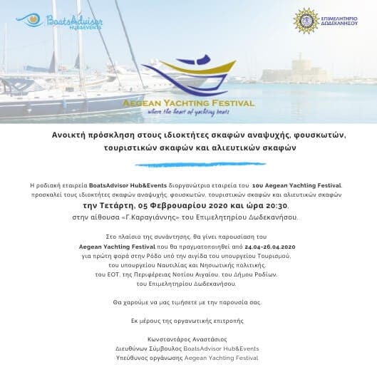 Η ροδιακή εταιρεία BoatsAdvisor Hub&Events διοργανώτρια εταιρεία του 1ου Aegean Yachting Festival, προσκαλεί τους ιδιοκτήτες σκαφών αναψυχής, φουσκωτών, τουριστικών σκαφών και