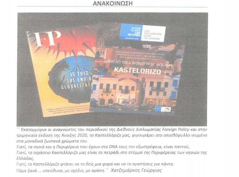Ευχαριστήρια επιστολή έλαβε σήμερα ο Περιφερειάρχης Νοτίου Αιγαίου Γιώργος Χατζημάρκος από τον Δήμο Μεγίστης, για τη στοχευμένη
