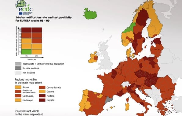 Στο κόκκινο βρίσκεται πλέον όλη η Ελλάδα με βάση τους τελευταίους ανανεωμένους χάρτες του Ευρωπαϊκού Κέντρου Πρόληψης και