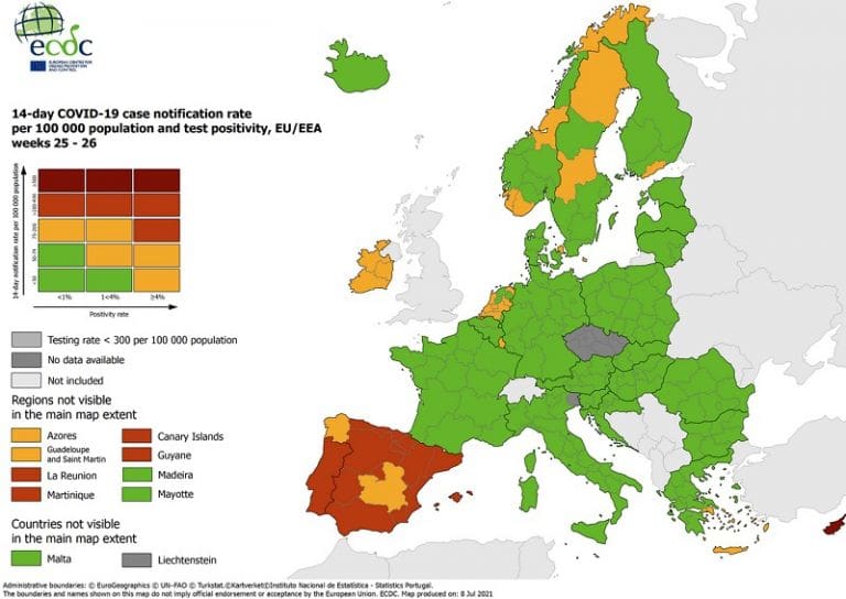 Το ECDC έδωσε στη δημοσιότητα τους χάρτες που δημοσιεύονται κάθε εβδομάδα, σύμφωνα με τους οποίους αρκετά νησιά στην Ελλάδα