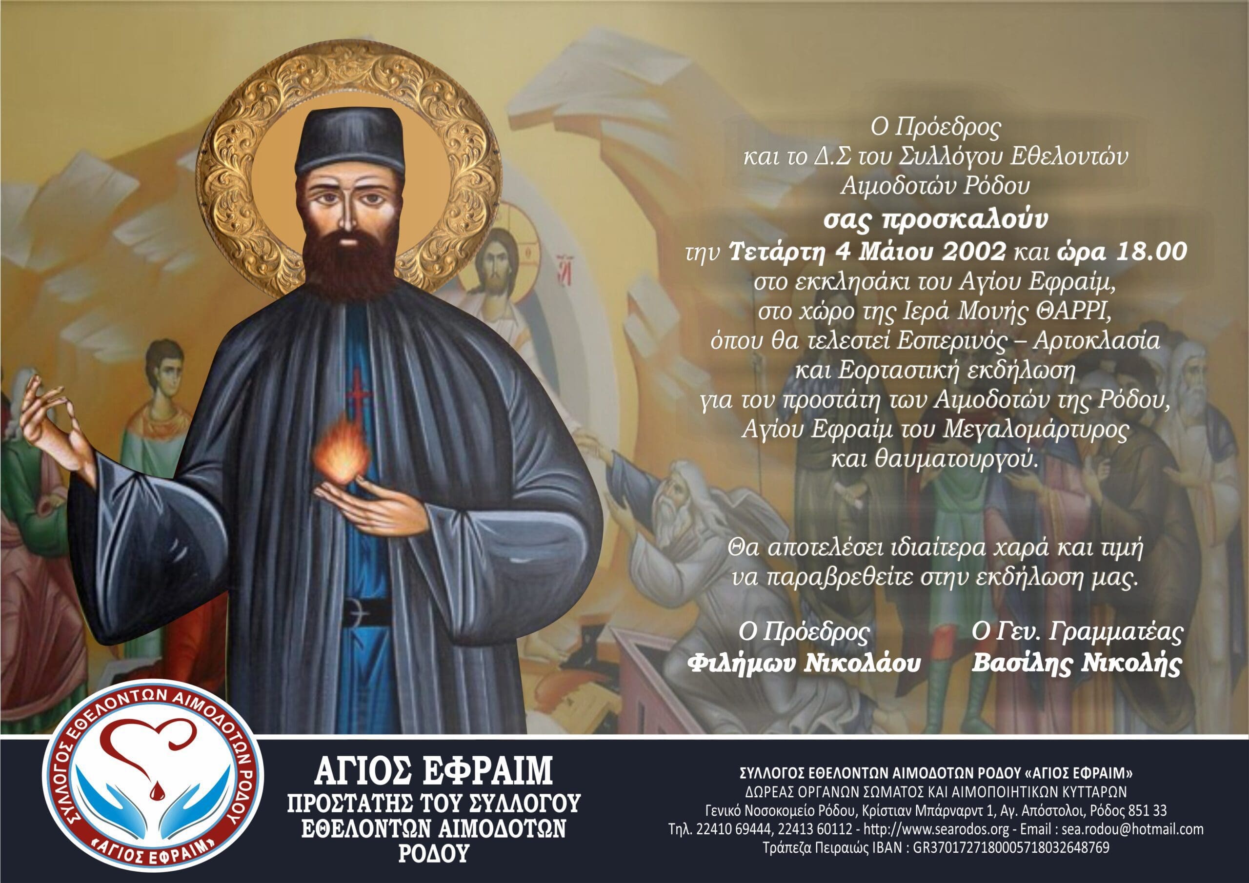 Ο Πρόεδρος και το Δ.Σ του Συλλόγου Εθελοντών Αιμοδοτών Ρόδου σας προσκαλούν την Τετάρτη 4 Μάιου 2002 και ώρα 18.00 στο