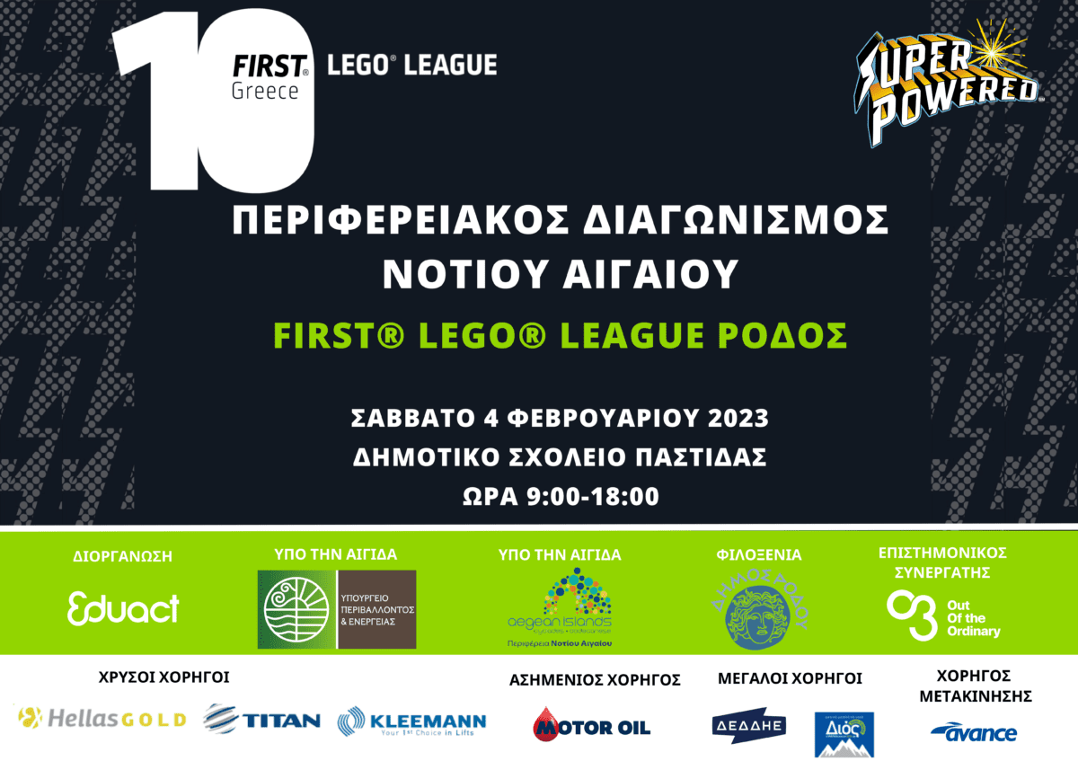 Το Σάββατο 4 Ιανουαρίου 2023, θα διεξαχθεί στην Ρόδο ο Περιφερειακός ΔιαγωνισμόςΝοτίου Αιγαίου του FIRST® LEGO® League,