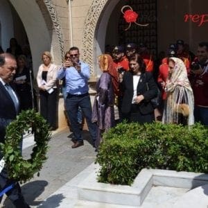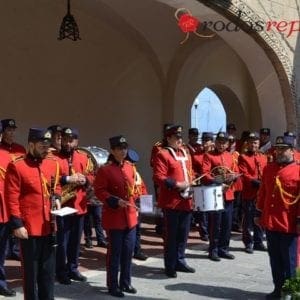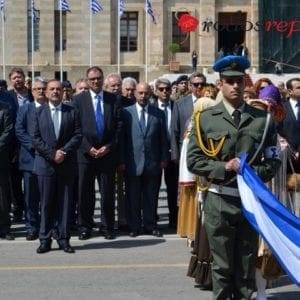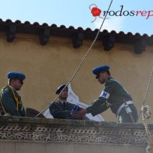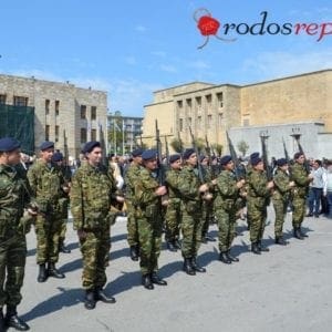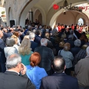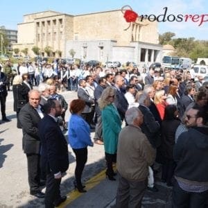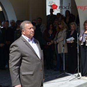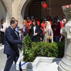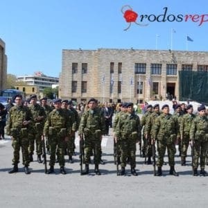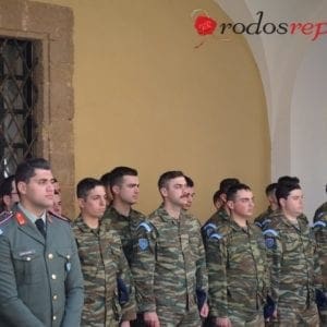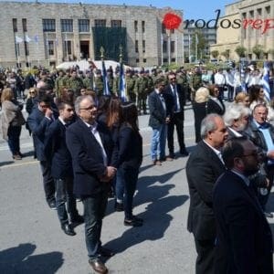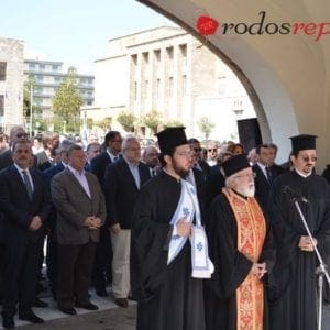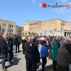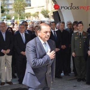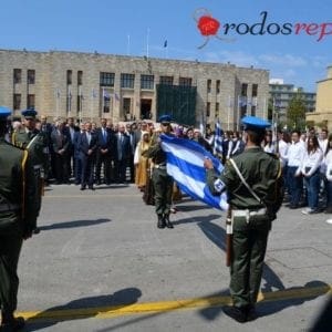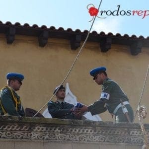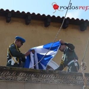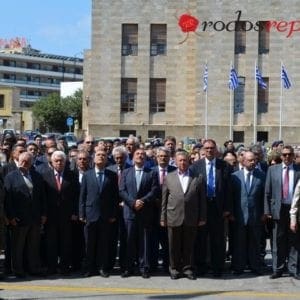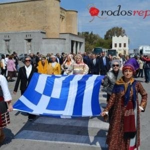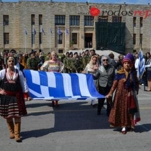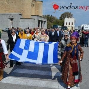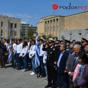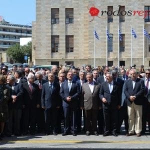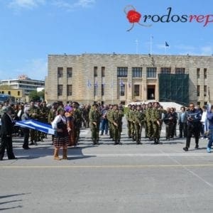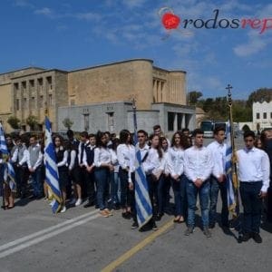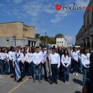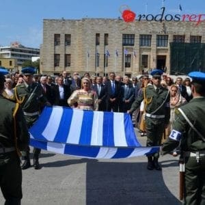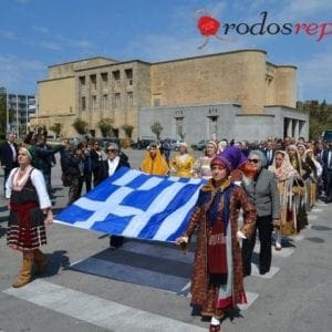 Σε μια συγκινητική τελετή η σημαία συνοδευόμενη από κοπέλες του Λυκείου Ελληνίδων από τα σκαλιά του Δημαρχείου μεταφέρθηκε στον Βωμό της Πατρίδας οπου στρατιωτικό άγημα απέδωσε τιμές . Την σημαία μας παρέλαβαν οι στρατονόμοι και μαζί με τον Ροδίτη Ιερολοχίτη Μαλανδράκη Ανδρέα την ύψωσαν στον ουρανό της Ρόδου .