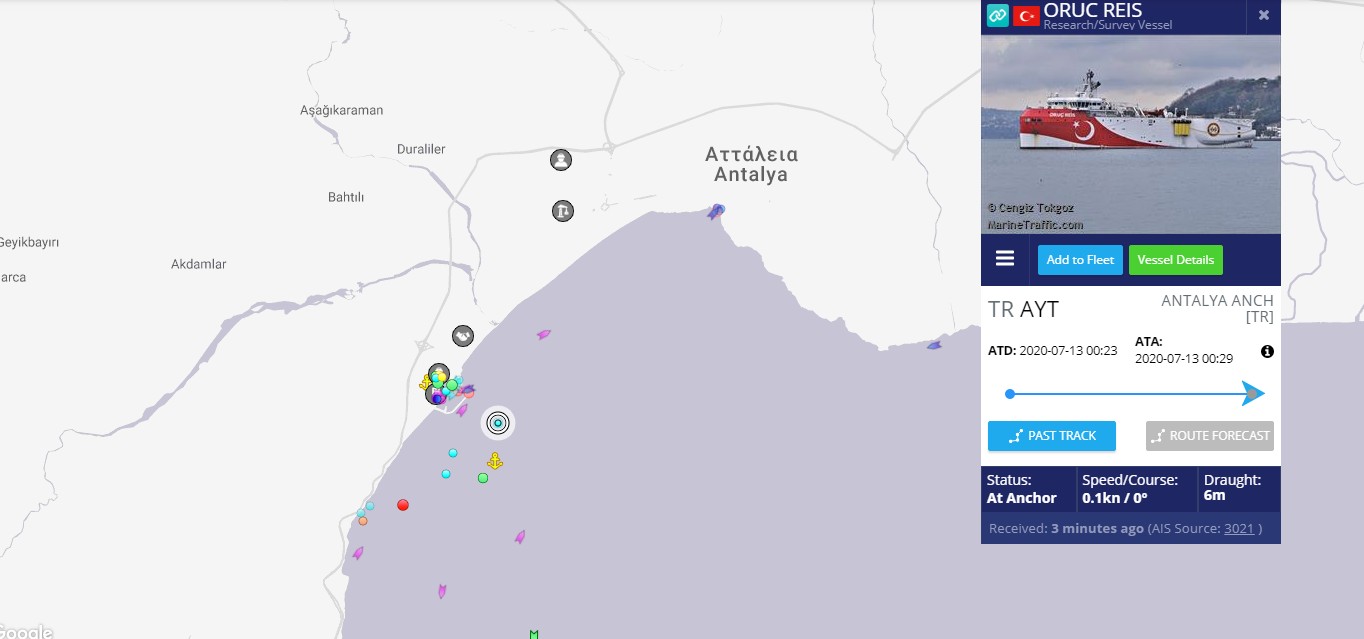Την ίδια στιγμή, το Oruc Reis παραμένει σταθερά αγκυροβολημένο στο λιμάνι της Αττάλειας.