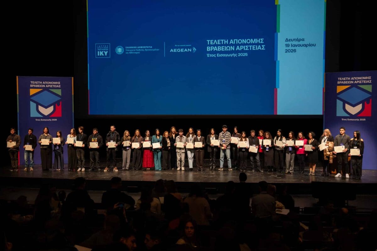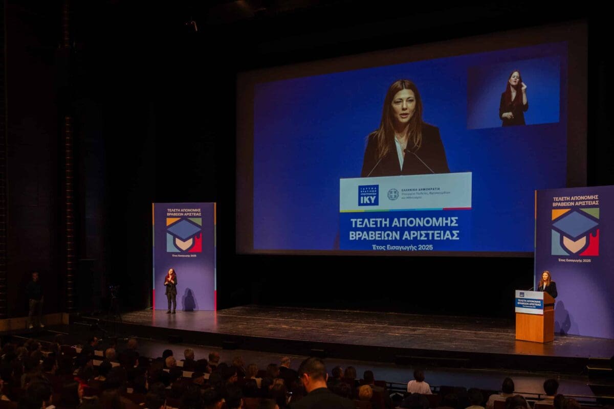 Με την υποστήριξη του Υπουργείου Παιδείας, Θρησκευμάτων και Αθλητισμού, το Ίδρυμα Κρατικών Υποτροφιών (ΙΚΥ), πραγματοποίησε την Δευτέρα 19 Ιανουαρίου 2026, στο Μέγαρο Μουσικής Αθηνών, επίσημη τελετή απονομής των Βραβείων Αριστείας στους/στις πρωτεύσαντες/σες εισαχθέντες/είσες των σχολών και τμημάτων των ιδρυμάτων τριτοβάθμιας εκπαίδευσης της χώρας. Τα βραβεία απένειμε η Υπουργός Παιδείας, Θρησκευμάτων και Αθλητισμού, κα. Σοφία Ζαχαράκη.