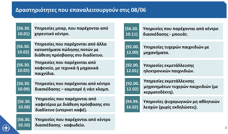 Τα επόμενα βήματα προς την πλήρη αποκατάσταση της οικονομικής δραστηριότητας θα γίνουν την επόμενη Δευτέρα 15 Ιουνίου, τη Δευτέρα 29 Ιουνίου και την 1η Ιουλίου.