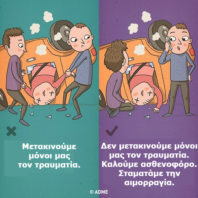 Όταν συμβαίνει ένα ατύχημα μη μετακινείτε τον τραυματία και μη προσπαθείτε να τον βγάλετε μόνοι σας από το όχημά του. Μπορεί να χειροτερέψετε τον τραυματισμό του. Η παραβίαση αυτού του κανόνα εφαρμόζεται μόνο σε περίπτωση ανάγκης, όταν π.χ. έχει πάρει φωτιά ο κινητήρας. Να τι πρέπει να κάνετε: