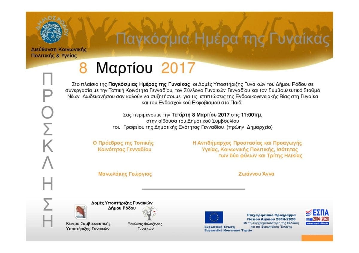 Στο πλαίσιο της Παγκόσμιας Ημέρας της Γυναίκας στις 8 Μαρτίου οι Δομές Υποστήριξης Γυναικών του Δήμου Ρόδου