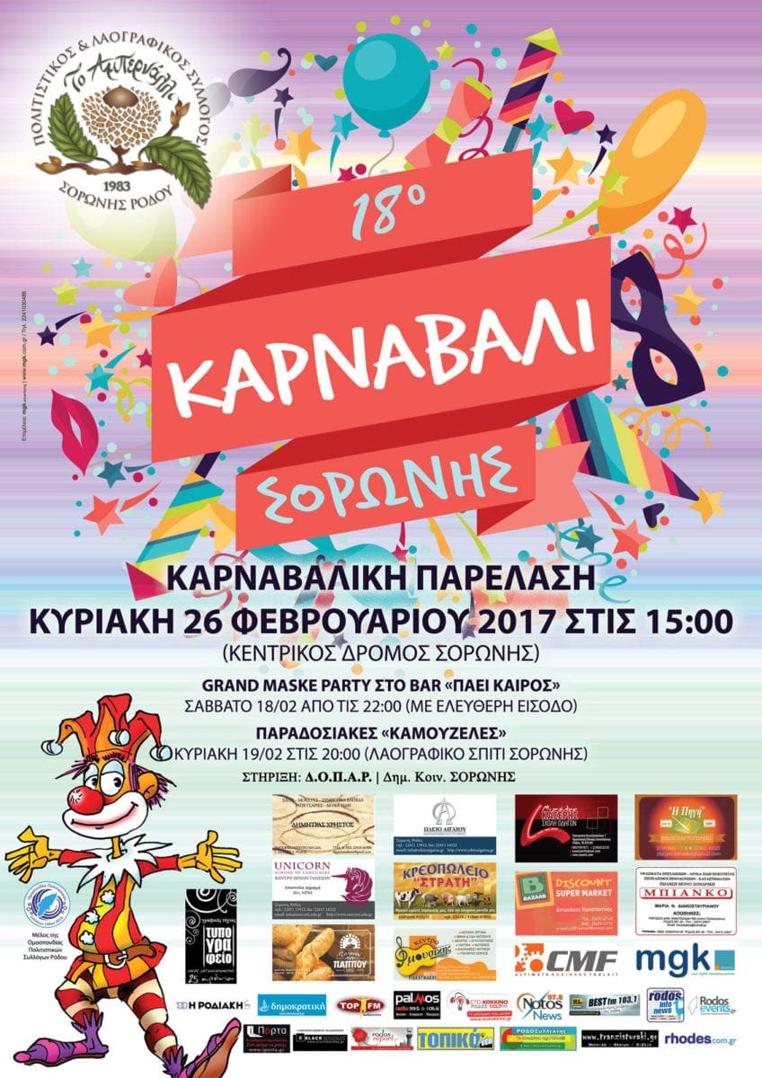 Ο Πολιτιστικός και Λαογραφικός Σύλλογος Σορωνής Ρόδου «Το Αμπερνάλλι» ενημερώνει σχετικά με το 18ο Καρναβάλι Σορωνής Ρόδου:
