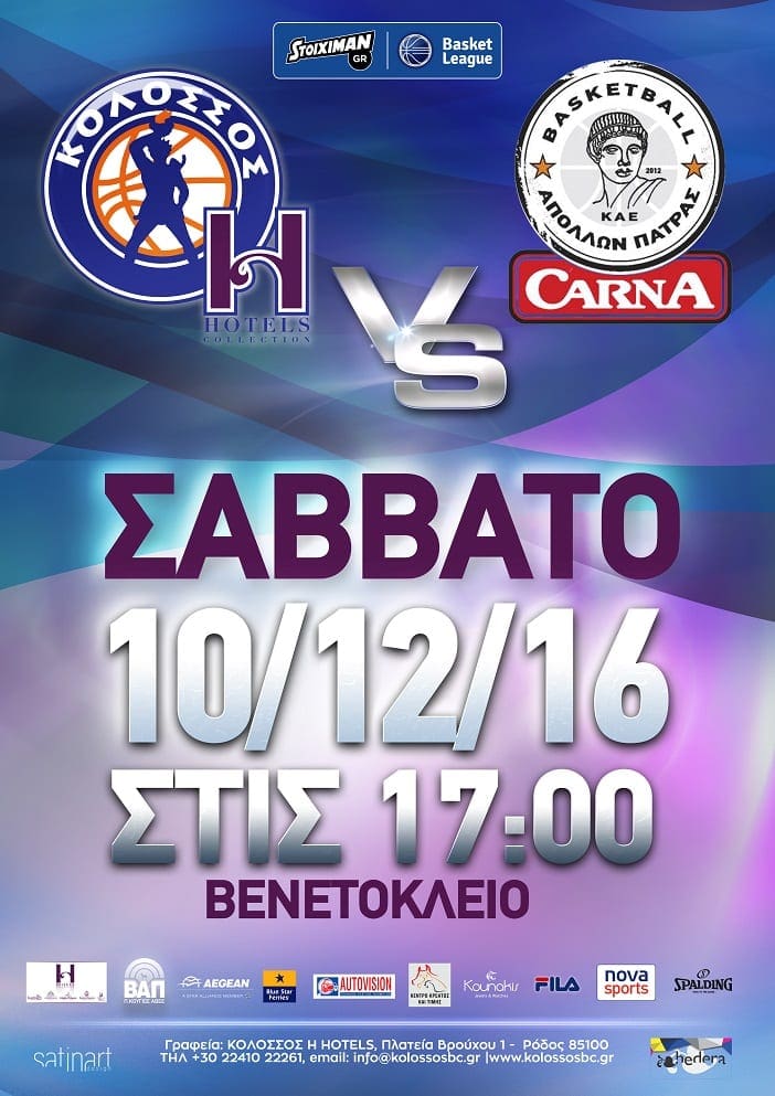 Το Σάββατο 10/12/16, ώρα 17.00, στο Βενετόκλειο, θα στηρίξουμε όλοι μαζί τον Κολοσσό H Hotels απέναντι στον Απόλλωνα