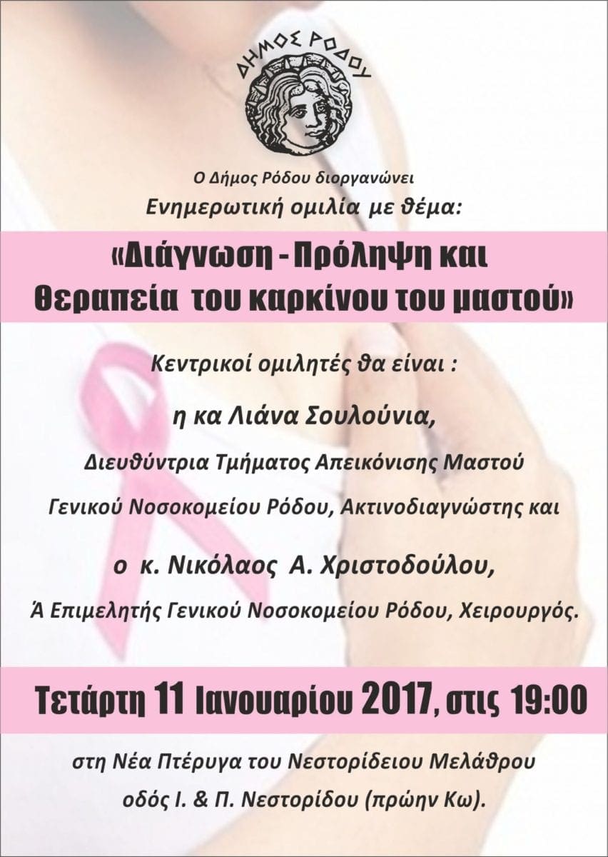 Η προγραμματισμένη για αύριο, Τετάρτη 11 Ιανουαρίου 2017, ενημερωτική ομιλία με θέμα: Διάγνωση-Πρόληψη και Θεραπεία του καρκίνου