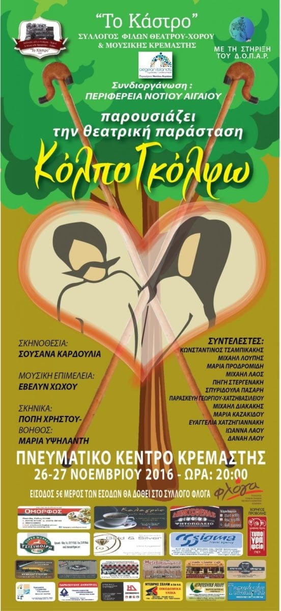 Ο Σύλλογος Φίλων Θεάτρου Χορού & Μουσικής Κρεμαστής «ΤΟ ΚΑΣΤΡΟ» ανακοινώνει ότι στις 26 & 17/11/2016 θα