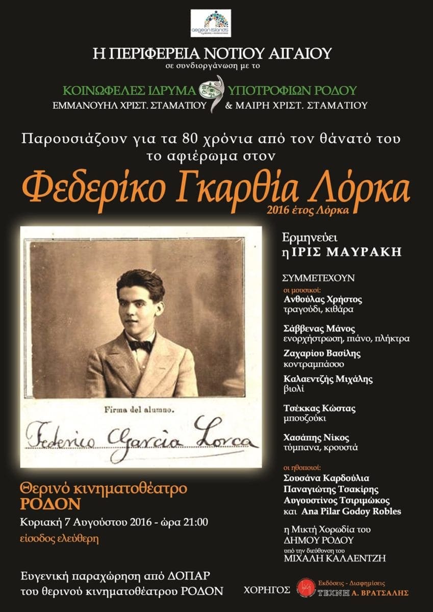 Κυριακή 7 Αυγούστου 2016 ‘Φεδερίκο Γκαρθία Λόρκα – Federico García Lorca’ η ΠΕΡΙΦΕΡΕΙΑ ΝΟΤΙΟΥ ΑΙΓΑΙΟΥ σε συνδιοργάνωση