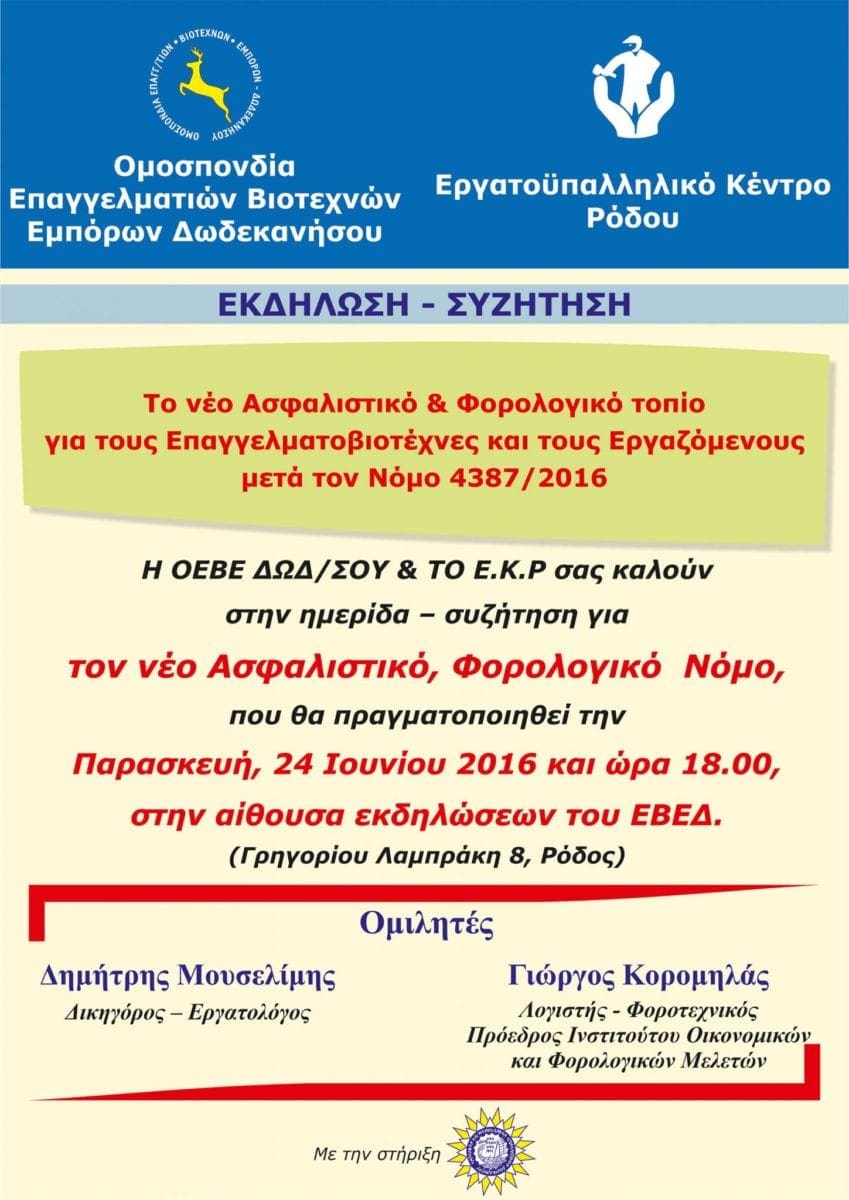 Η Ομοσπονδία Επαγγελματιών Βιοτεχνών Εμπόρων Δωδεκανήσου και το Εργατοϋπαλληλικό Κέντρο Ρόδου, με τη στήριξη του ΕΒΕΔ, οργανώνουν