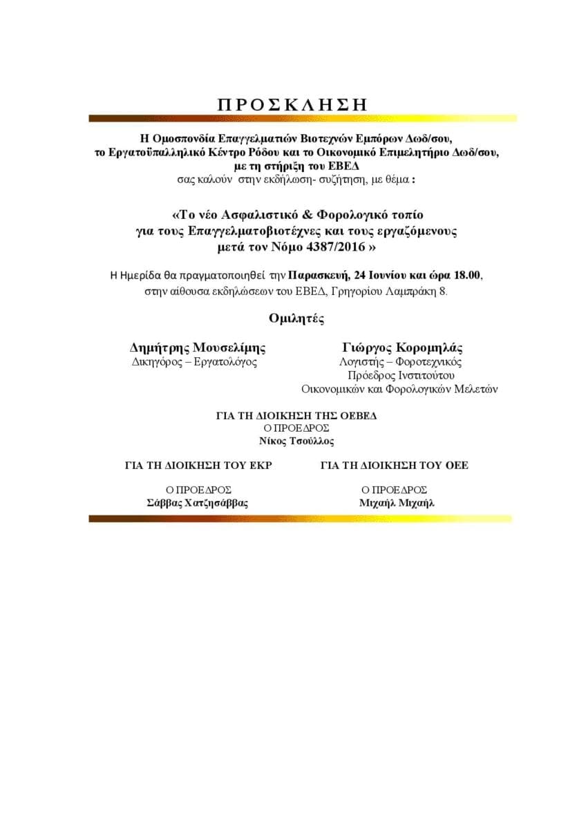 Η Ομοσπονδία Επαγγελματιών Βιοτεχνών Εμπόρων Δωδ/σου, το Εργατοϋπαλληλικό Κέντρο Ρόδου και το Οικονομικό Επιμελητήριο Δωδ/σου, με τη