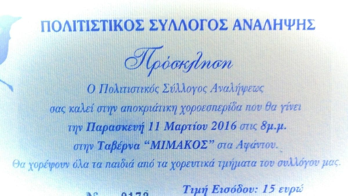 Αποκριάτικη χοροεσπερίδα διοργανώνει ο Πολιτιστικός Σύλλογος Ανάληψης στην ταβέρνα “Μιμάκος”