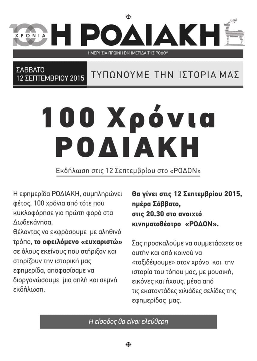 Η εφημερίδα ΡΟΔΙΑΚΗ, με αφορμή την συμπλήρωση 100 χρόνων από τη μέρα που εκδόθηκε και κυκλοφόρησε για