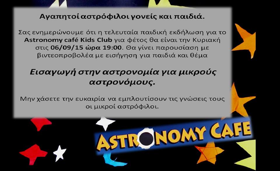 Αγαπητοί αστρόφιλοι γονείς και παιδιά. Σας ενημερώνουμε ότι η τελευταία παιδική εκδήλωση για το Astronomy café Kids