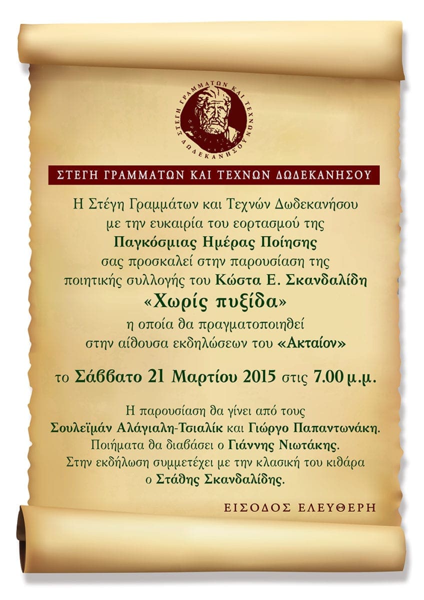 Η Στέγη Γραμμάτων και Τεχνών Δωδεκανήσου με την ευκαιρία του εορτασμού της παγκόσμιας ημέρας ποίησης σας προσκαλεί