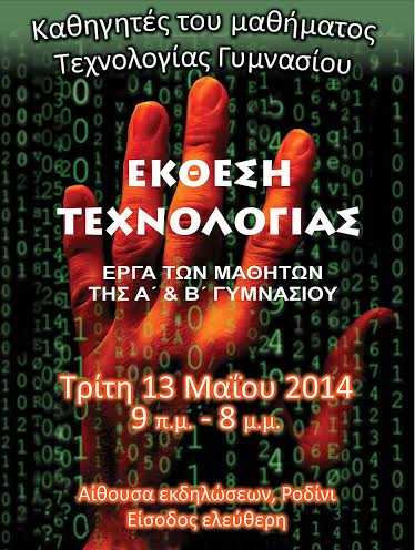 Σας ενημερώνουμε ότι θα πραγματοποιηθεί Έκθεση Τεχνολογίας Γυμνασίου των σχολείων της Ρόδου την Τρίτη 13 Μαΐου 2014