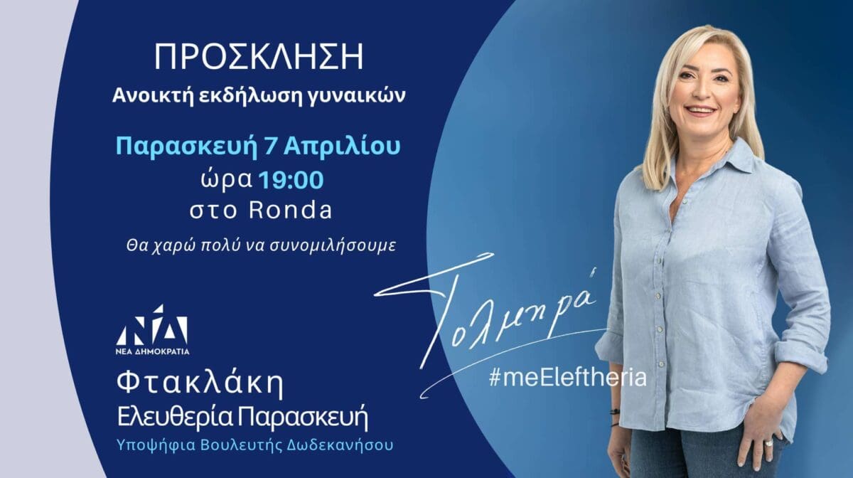 Ανοικτή πολιτική εκδήλωση γυναικών διοργανώνει στη Ρόδο η υποψήφια Βουλευτής Δωδεκανήσου της Νέας Δημοκρατίας, Ελευθερία Φτακλάκη, ενόψει