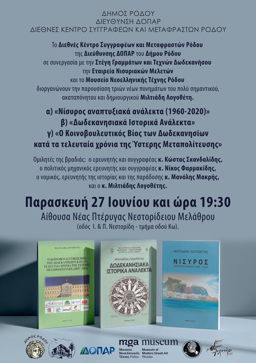 Το Διεθνές Κέντρο Συγγραφέων και Μεταφραστών Ρόδου της Διεύθυνσης ΔΟΠΑΡ του Δήμου Ρόδου, σε συνεργασία με την Στέγη Γραμμάτων και Τεχνών Δωδεκανήσου, την Εταιρεία