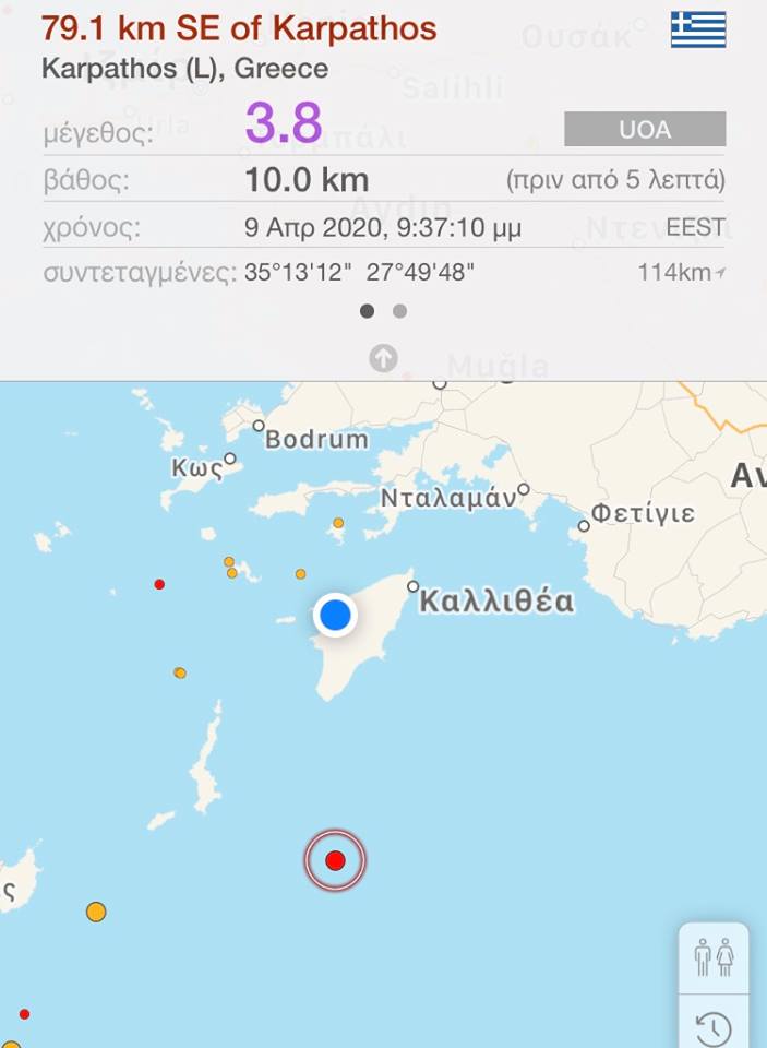 Σεισμική δόνηση 3,8 Ρίχτερ(πρώτη εκτίμηση) σημειώθηκε πριν απο λίγα λεπτά στα Δωδεκάνησα και συγκεκριμένα Ανατολικά της Καρπάθου