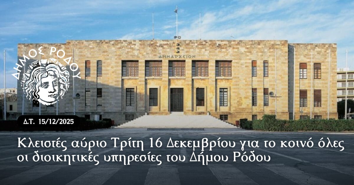 Κλειστές θα είναι αύριο Τρίτη 16 Δεκεμβρίου για το κοινό όλες οι διοικητικές υπηρεσίες του Δήμου Ρόδου