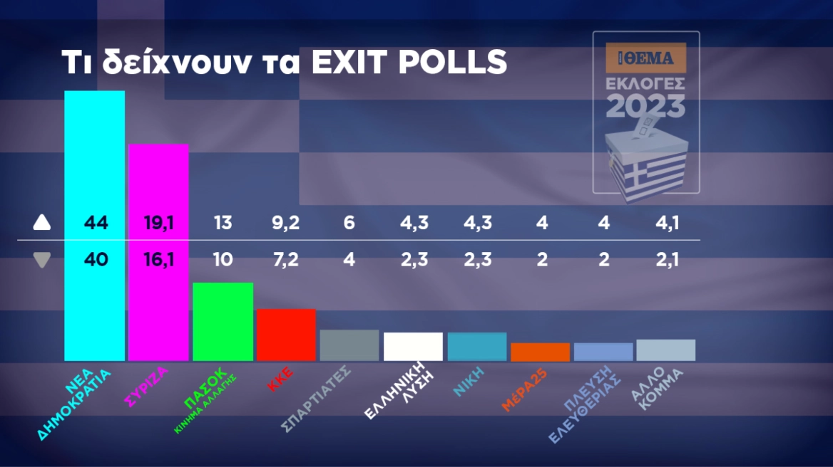 Σαρωτική νίκη της Νέας Δημοκρατίας στις σημερινές εκλογές με ιστορική διαφορά από τον δεύτερο ΣΥΡΙΖΑ και ισχυρή κυβέρνηση δείχνουν τα exit polls που ανακοινώθηκαν με